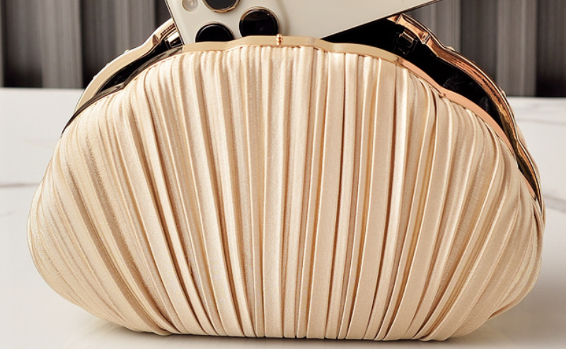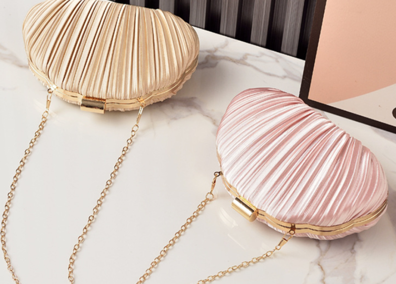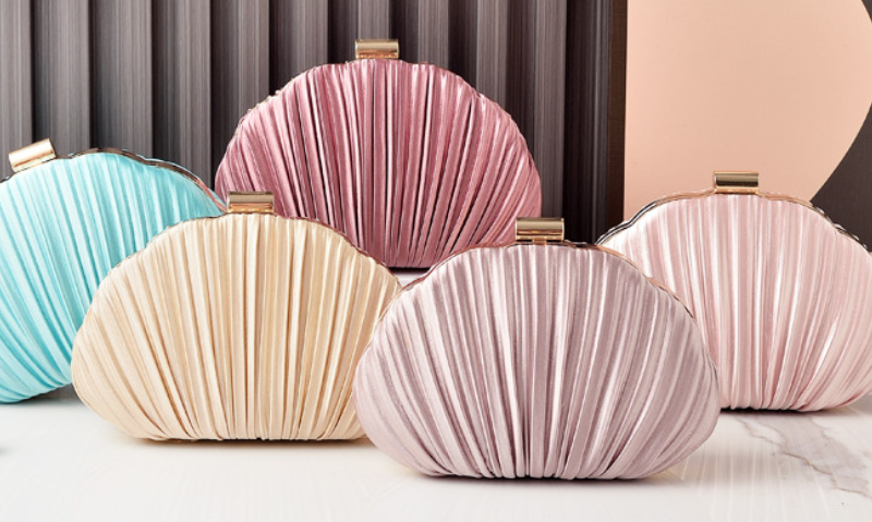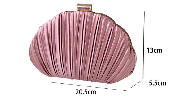These delightful clutches feature elegant, finely ruched satin in an array of soft, enchanting colors, creating a beautiful fan-like texture. Each bag is framed with subtle gold accents and a classic kiss-lock clasp, offering timeless sophistication. Perfect for adding a vibrant yet refined touch to any evening ensemble, these clutches are versatile accessories for weddings, proms, or special celebrations.