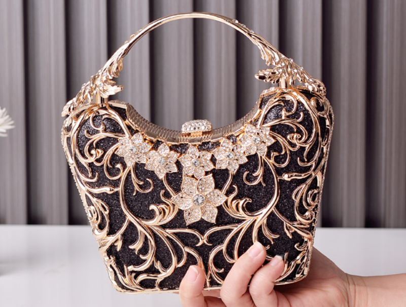 This ornate evening bag features intricate gold filigree, sparkling crystal floral accents, and a shimmering black base. Its unique structure and elegant handle make it a true statement piece for any special occasion. A luxurious accessory designed to captivate and complement your most glamorous attire.