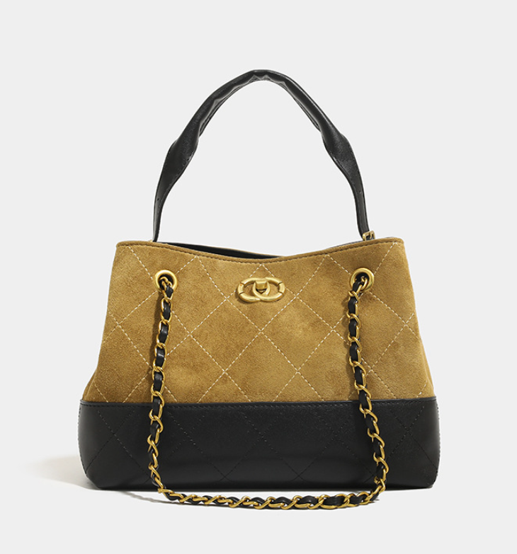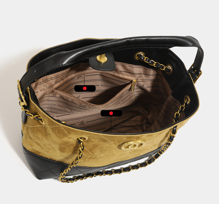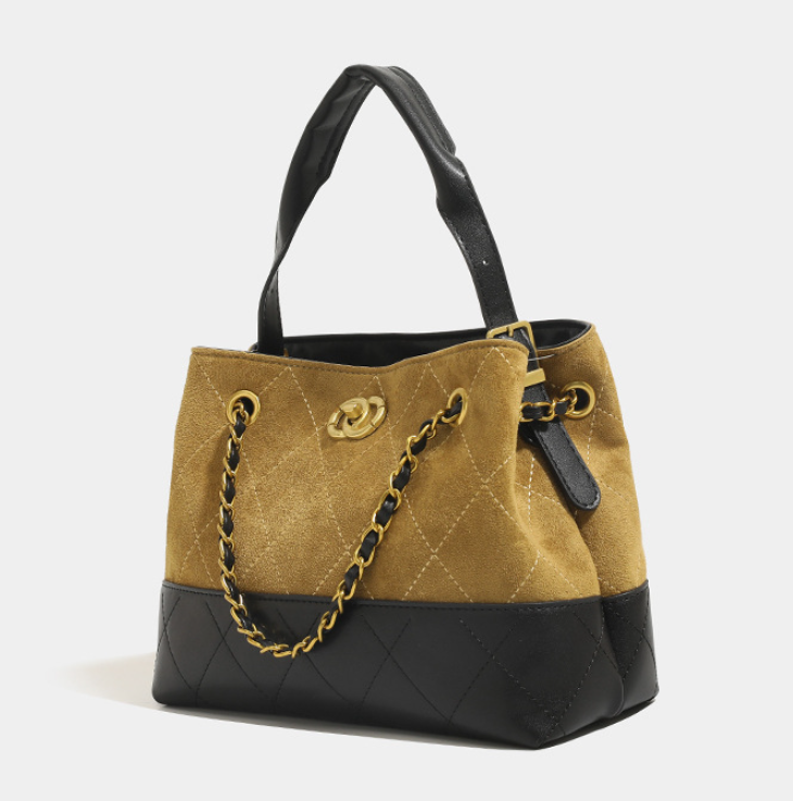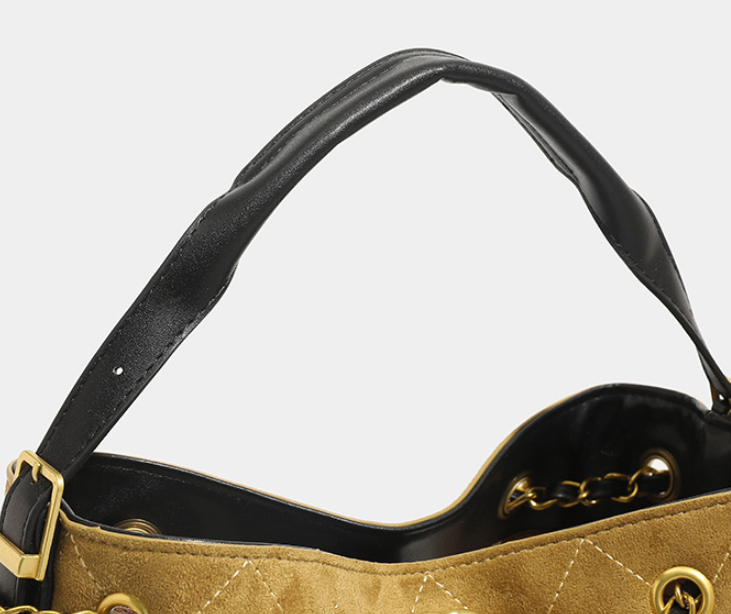The High-End Suede Chain Bucket Bag features a soft suede texture paired with a refined chain detail, creating a stylish and high-end look. Designed in a new fashion style, this bucket bag balances elegance with everyday practicality.