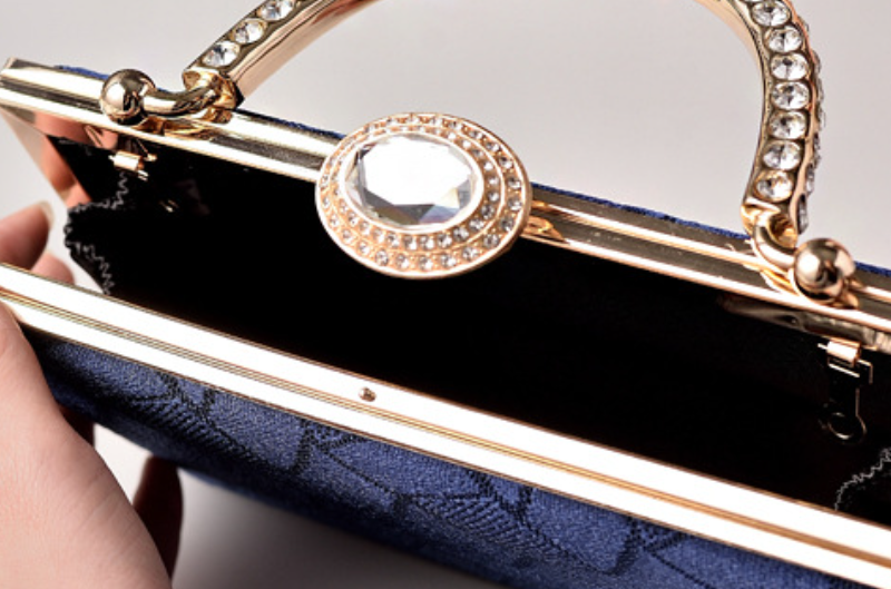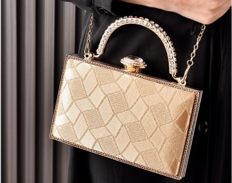 This sophisticated box clutch features a captivating geometric grid pattern in a radiant champagne hue, offering a blend of modern design and classic elegance. It's crowned with a dazzling crystal-embellished handle and a complementary sparkling clasp, adding luxurious detail. Versatile with a detachable chain strap, it's the perfect accessory to elevate your evening wear or add refined sparkle to any special occasion